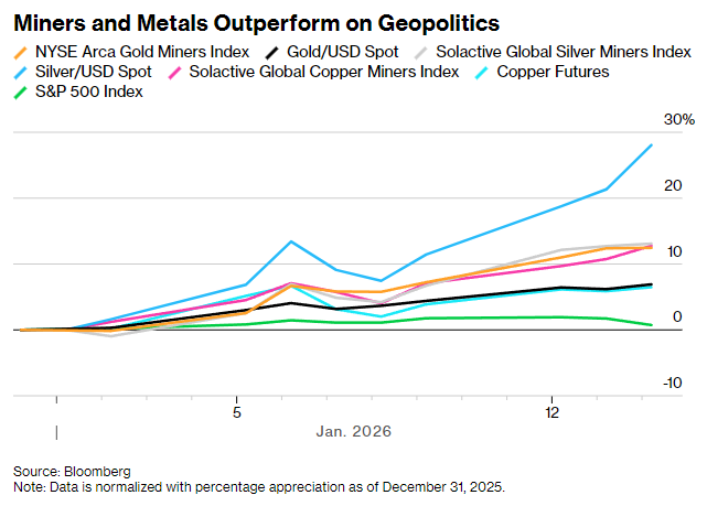 2026年至今,纽交所Arca黄金矿业指数已上涨约12%,跑赢了现货黄金6.9%的涨幅和标普500指数0.7%的涨幅。随着美国与伊朗、委内瑞拉之间的风险持续升级,资金加速涌入具备保值属性的大宗商品,不少投资者开始调仓布局矿业股。