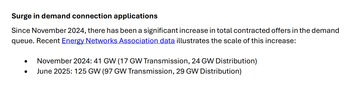 英国电力监管透露,自2024年11月以来,需求队列里的签约报装量激增。截至今年6月的可用数据,接入电网的需求从41吉瓦暴增至125吉瓦,其中输电需求暴增80吉瓦。需求总量已经达到目前英国用电峰值的两倍多。