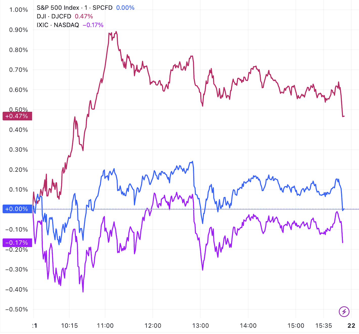 截至收盘,道琼斯指数涨0.47%,报46,924.74点;标普500指数平收,报6,735.35点;纳斯达克指数跌0.16%,报22,953.67点。