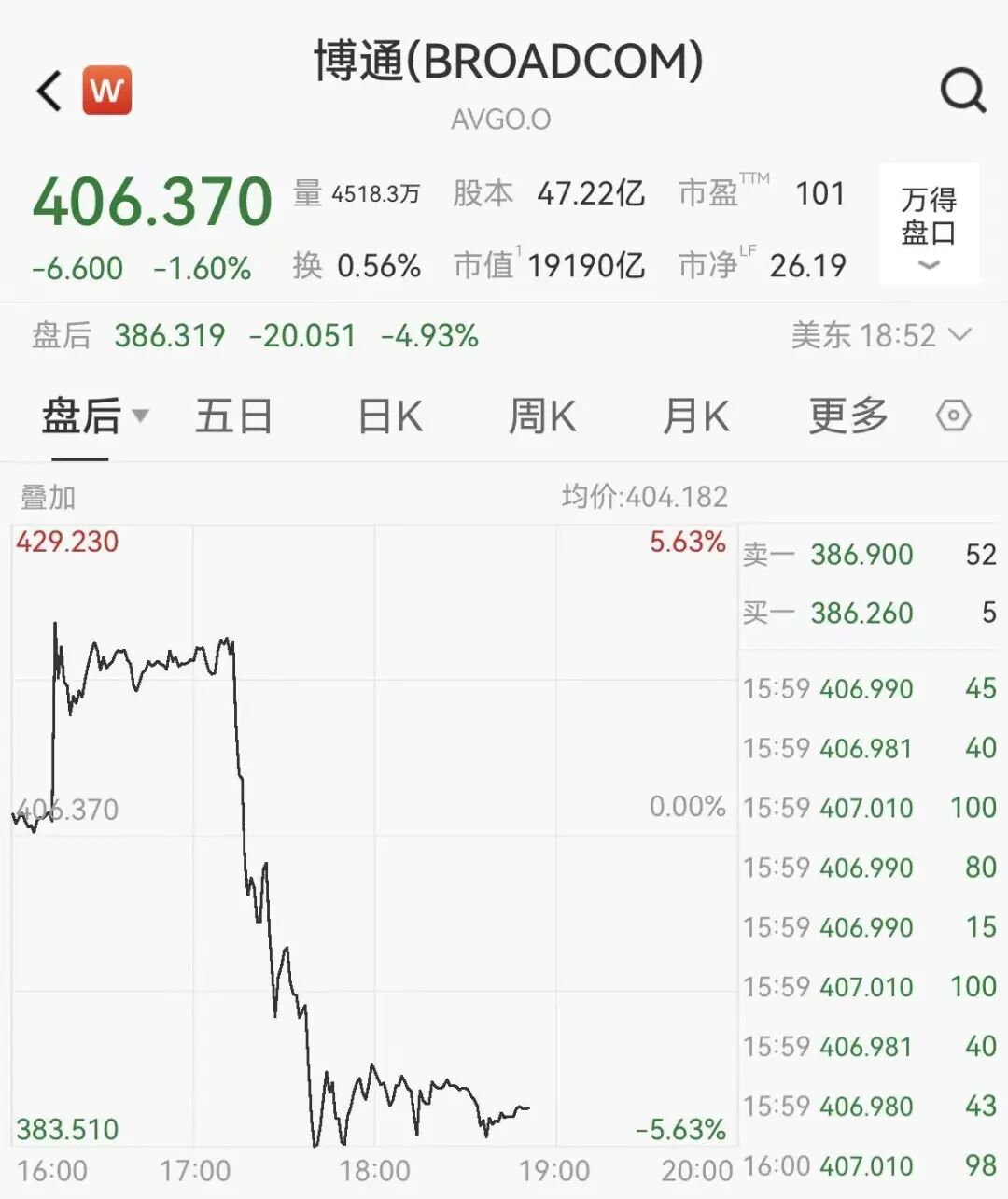 博通收跌1.6%,但盘后加速下跌,跌幅一度超5%。财报显示,博通2025财年第四财季营收180.1亿美元,同比增长28%,市场预期为184.8亿美元;净利润97.1亿美元,同比增长39%,调整后每股净利润1.95美元,同比增长37%。2026财年第一季度营收指引约为191亿美元,较上年同期增长28%,2026财年第一季度调整后息税折旧摊销前利润指引为预计营收的67%。公司预计第一财季毛利润率将因AI产品而收缩1%。