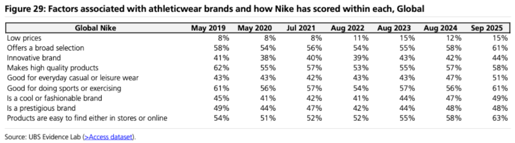 运动属性回归: 认为耐克“适合做运动”的消费者比例已回升至2019年的峰值水平。