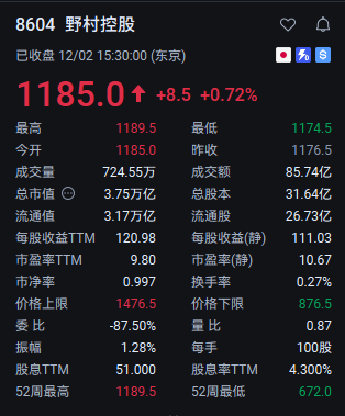 智通财经APP获悉,野村控股(NMR.US)市净率自2016年以来首次触及1倍关口,满足了东京交易所在其提升股东价值举措中设定的一项重要基准。周二,野村在东京交易所上市的股票一度上涨1.1%,至1189.5日元,创下2008年10月以来的最高水平,同时推动该股市净率突破1倍。截至发稿,该股收涨0.72%,报1185.0日元。