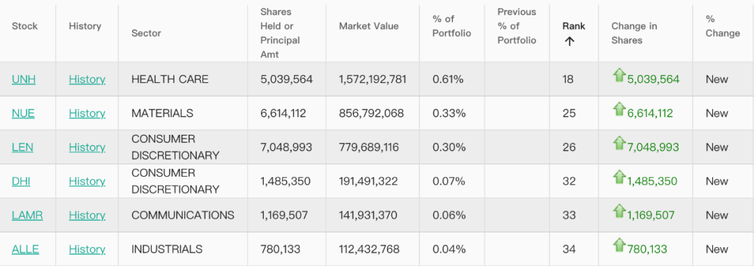 具体为:买入联合健康(UNH)逾500万股,季末持股市值约15.7亿美元;买入纽柯钢铁(NUE)逾660万股,季末市值约8.6亿美元;买入莱纳建筑(LEN)逾700万股,季末市值约7.8亿美元,买入霍顿房屋(DHI)148.5万股,季末市值约1.9亿美元;买入拉马尔户外广告(LAMR)约117万股,季末市值约1.4 亿美元;买入安朗杰(ALLE)78万股,季末市值约1.1亿美元。上述新建仓股票的合计季末市值约为36.5亿美元。