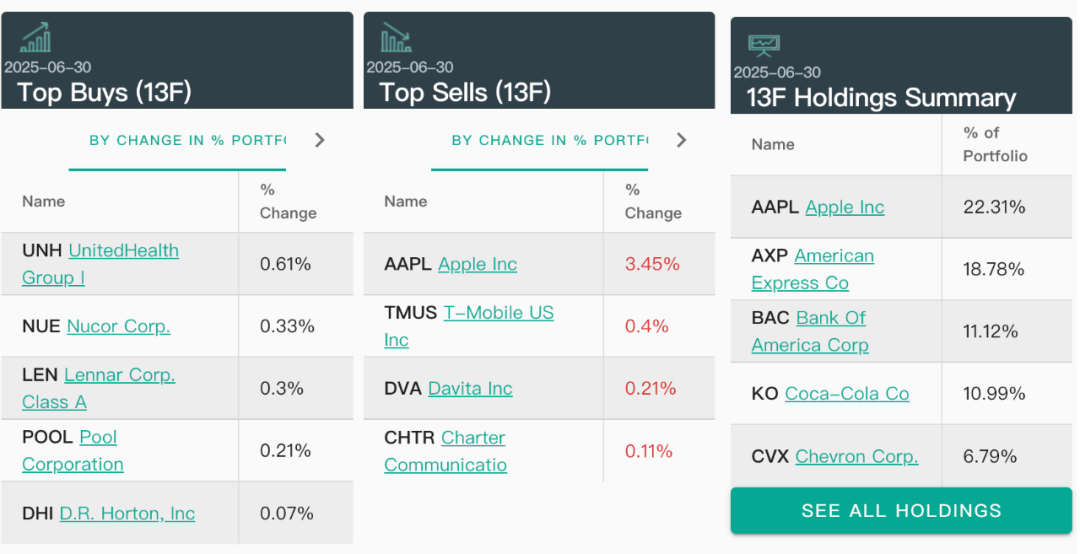 截至二季度末,伯克希尔的前五大持仓分别为:苹果、美国运通、美国银行、可口可乐、雪佛龙。