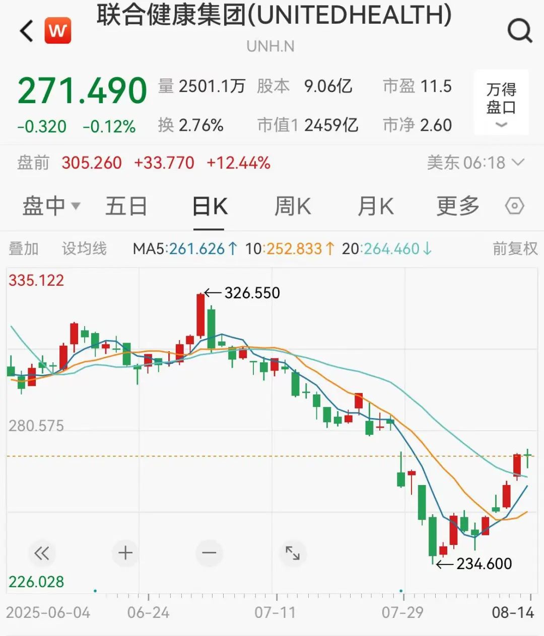 在连续出现丑闻、公司股价大幅下跌后,联合健康成为巴菲特最新买入的股票,引发市场关注。当地时间8月15日美股盘前,联合健康股价大幅上涨,一度涨超13%,目前仍有超过12%的涨幅。