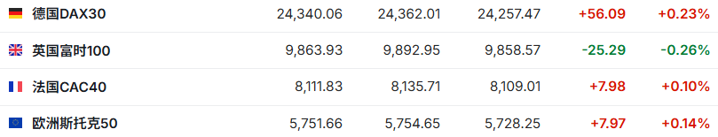 2. 截至发稿,德国DAX指数涨0.23%,英国富时100指数跌0.26%,法国CAC40指数涨0.10%,欧洲斯托克50指数涨0.14%。