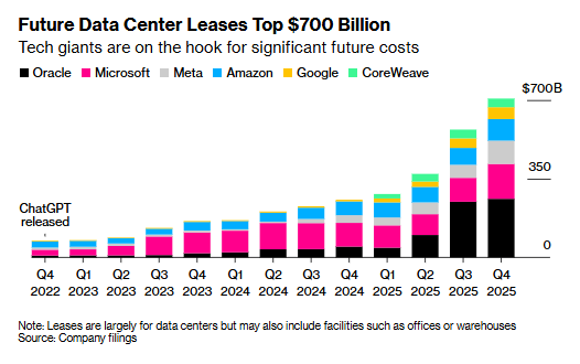 根据对企业季度财报文件的分析显示,包括微软、Meta、甲骨文(ORCL.US)、亚马逊(AMZN.US)在内的头部云计算巨头,未来数据中心租赁总承诺已突破7000亿美元。过去一年,随着科技巨头接连签下服务器机房租赁协议,此类未来支出承诺持续攀升。