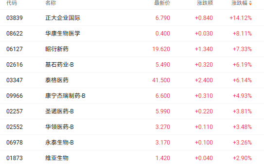 港股医药板块今日普遍上扬,主要受市场利好消息提振。截至发稿,正大企业国际(03839.HK)涨14.12%、昭衍新药(06127.HK)涨7.33%、基石药业-B(02616.HK)涨6.19%、泰格医药(03347.HK)涨6.14%。