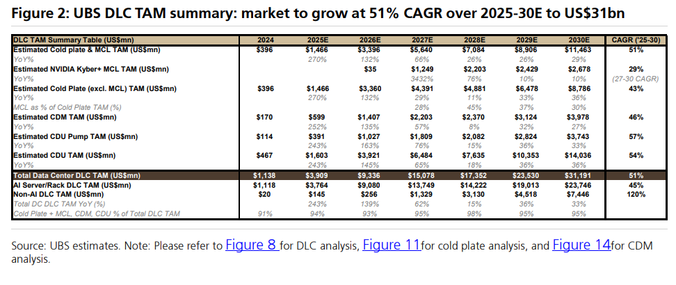 瑞银进一步拆分了市场构成,预计到2030年,AI服务器液冷市场将达到237亿美元,而非AI服务器的液冷市场也将增长至74亿美元。这表明,液冷革命正从AI领域向整个数据中心行业扩散。
