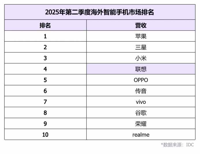 智通财经获悉,国际数据公司(IDC)最新报告显示,在除中国以外的海外市场,智能手机总营收达913亿美元,同比增长9.2%,大幅超越此前1.2%的增长预期。在此背景下,联想集团手机业务在海外市场表现尤为亮眼,以强劲的双位数营收增长巩固了全球第四的地位:营收同比飙升14.6%,市场份额达5.4%。与此同时,联想摩托罗拉在全球范围内的营收份额也增长至3.0%,排名第八。