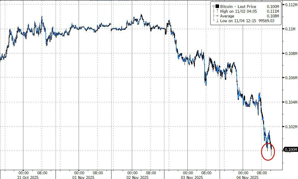 美股午盘,据华尔街见闻,美国政府停摆即将打破历史纪录的消息,进一步加剧了市场的不确定性。纳指跌幅一度扩大至1.7%。与此同时,加密货币市场崩盘,比特币失守10万美元整数关口,为6月以来首次,日内跌幅超过6.5%,拖累相关概念股集体暴跌。