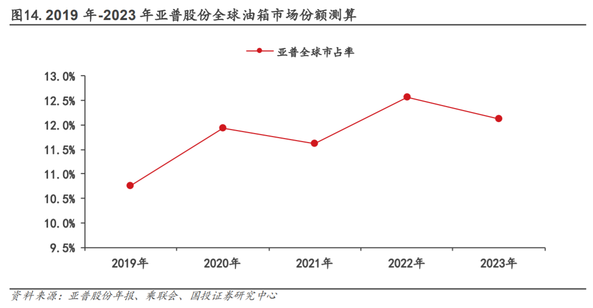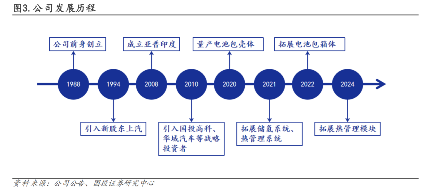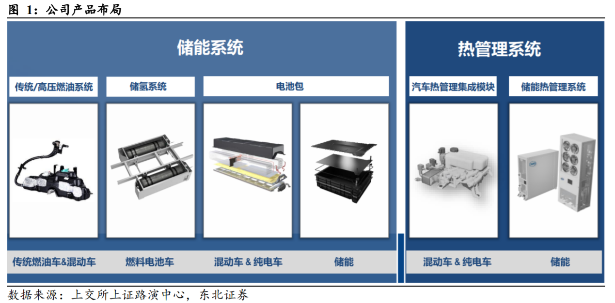 公司传统业务是乘用车塑料油箱及注油管,深耕行业三十余年,目前已成长为全球乘用车塑料油箱龙头,国内市占率排名第一,全球市占率排名第三,客户覆盖国内外主流车企。公司积极拓展海外市场,目前已设立9个海外生产基地以及4个海外工程技术中心。公司近几年成功研发并量产混动高压油箱,并逐步拓展新能源汽车热管理储氢系统电池包壳体等新业务。