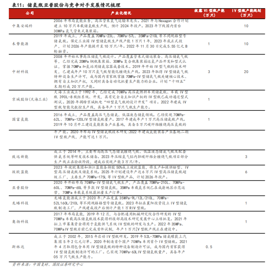 前瞻性布局储氢技术,商业化推广进行中:氢能车相较于燃油车使用可再生能源、减少碳排放,相较于电动车补能更快、且低温环境下工作性能更好,长期来看发展潜力大。短期受制于成本、加氢站建设等问题,氢能车推广进度较慢。据高工氢电产业研究所预测,2026/2030年国内车载储氢瓶市场需求量约32/224万只,2022-2030年市场CAGR超过50%,储氢瓶市场空间快速扩容,同时玩家也逐渐增多。公司目前数款储氢系统产品均已通过型式认证,与国内主流的商用车企业一汽解放、奇瑞万达、亚星客车等建立了深入合作关系,核心部件70MPa储氢瓶阀正在认证,后续自研核心部件的突破有望进一步提升公司在车载储氢系统方面竞争力,有利于公司加速开拓客户。