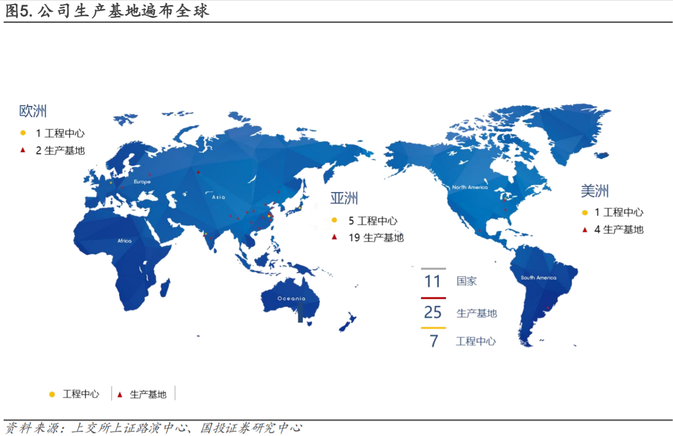 二是“布局全”:目前,公司已在全球4大洲11个国家建立了25生产基地和7个工程技术中心。完整的布局使能够更好地贴近客户,为他们提供及时、高效的服务,同时也提升了的全球同步开发和技术支持能力。