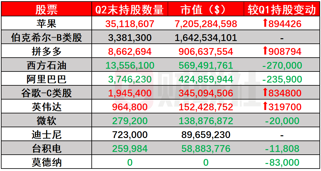 第一大持仓自然是苹果公司。一改过去连续四个季度减持苹果的操作,H&H二季度增持89万股。
