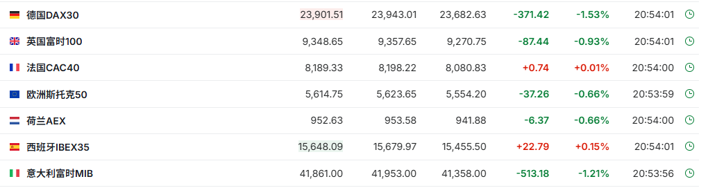 正在交易的欧洲股市涨跌不一,德国DAX指数现跌1.53%,英国富时100指数跌0.93%,法国CAC40指数涨0.01%。