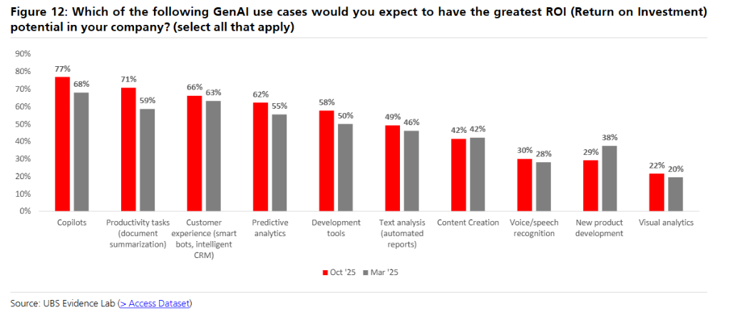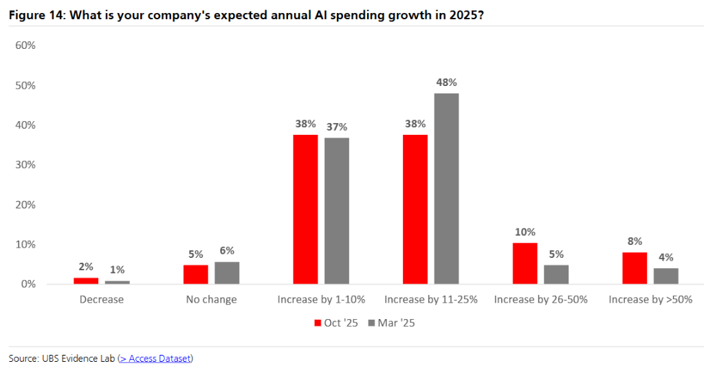 据追风交易台,瑞银Karl Keirstead团队最新发布的第五次企业AI调查显示,仅17%的受访企业实现了AI项目的大规模投产,相较今年3月的14%仅略有提升。
