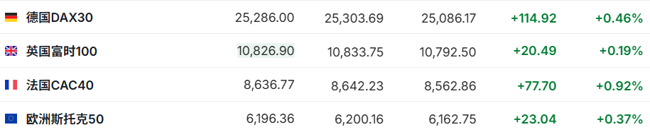 2. 截至发稿,德国DAX指数涨0.46%,英国富时100指数涨0.19%,法国CAC40指数涨0.92%,欧洲斯托克50指数涨0.37%。