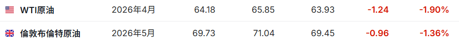 3. 截至发稿,WTI原油跌1.90%,报64.18美元/桶。布伦特原油跌1.36%,报69.73美元/桶。