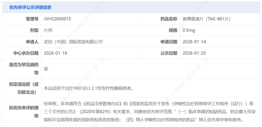 智通财经APP获悉,中国国家药监局药品审评中心官网近日公示显示,武田(TAK.US)申报的1类新药奥博雷通片(oveporexton,TAK-861片)的上市申请拟纳入优先审评,适用于治疗16岁及以上1型发作性睡病(NT1)患者。公开资料显示,这是武田研发的一款口服选择性食欲素2型受体(OX2R)激动剂。该产品针对NT1适应症的两项3期关键性研究已经达到所有主要和次要终点。