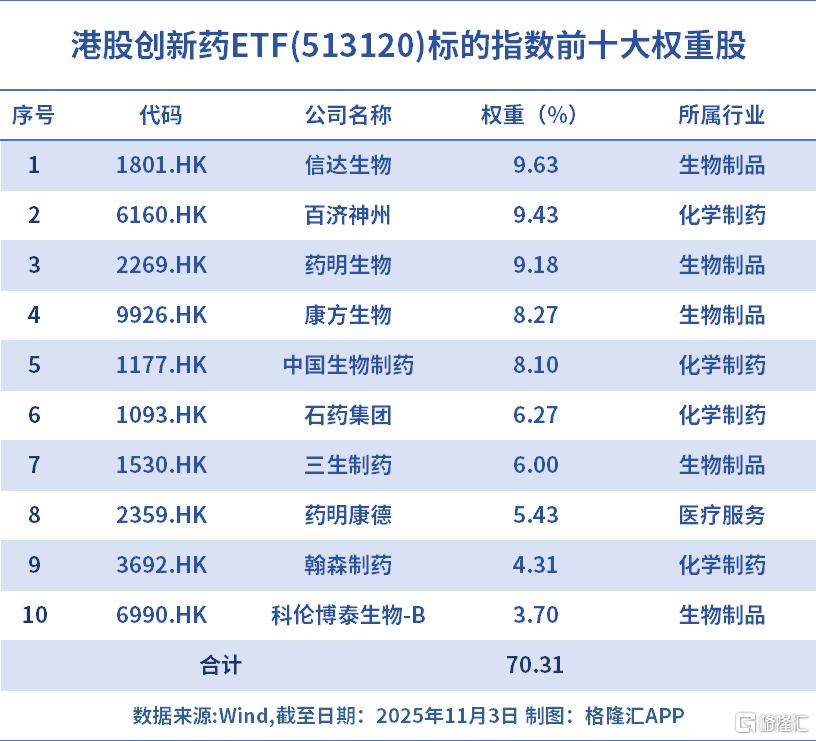 事实上,有些ETF基金确实很好做到了对创新药头部药企的跟踪覆盖。比如全市场规模最大的港股创新药ETF(513120,联接A/C类019670/019671),高度聚焦港股市场优质生物科技公司,覆盖创新药、基因治疗、前沿生物技术等细分领域龙头,申万二级生物制品+化学制药合计权重达88.9%,创新药“浓度”极高,成份股包含了信达生物、百济神州、康方生物等核心的港股18A生物科技公司。