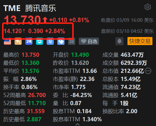 美股异动丨腾讯音乐盘前涨约3% 推“鹅票票”购票平台 杀入演出票务赛道