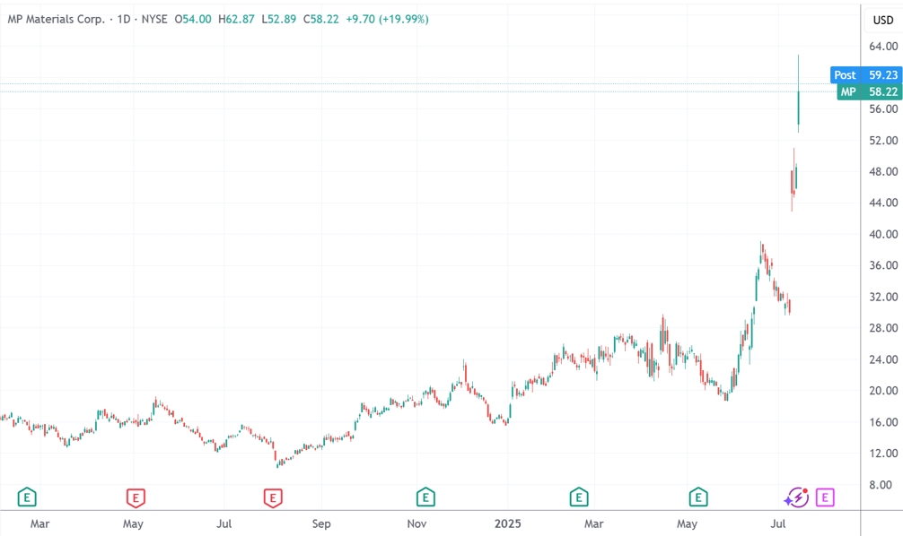 另一个创历史新高的是美国稀土概念股MP Materials。公司与科技巨头苹果达成一份5亿美元的稀土磁铁采购协议。上周美国国防部才同意收购MP Materials约15%的优先股和认股权证,完全转换后将成为公司最大股东。