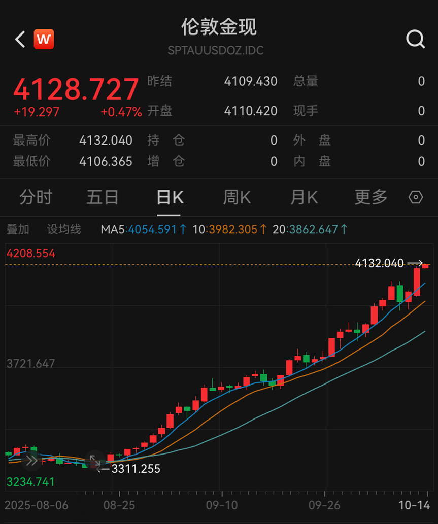 贵金属价格持续飙涨,现货黄金、白银价格再度双双创出历史新高。截至周一收盘,现货黄金站上4100美元/盎司关口,现货白银价格涨超4%,突破52美元/盎司关口。