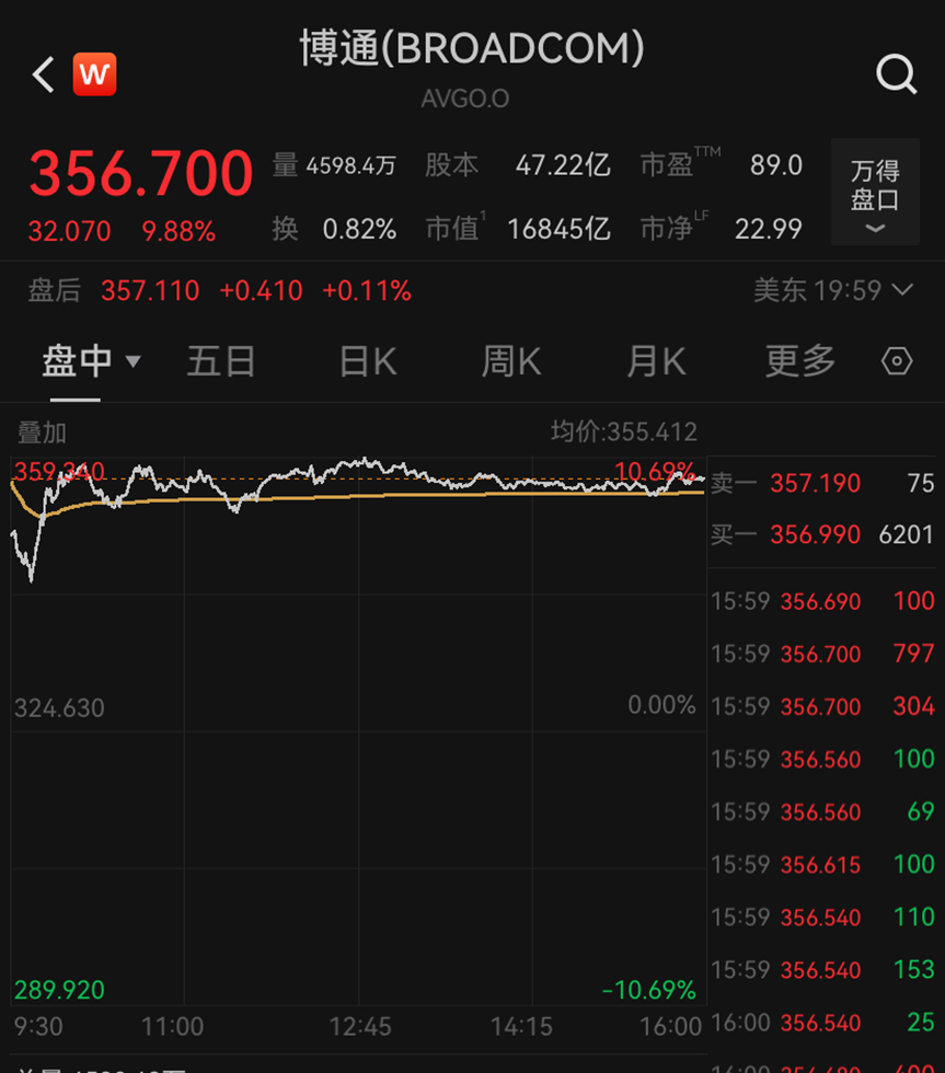 受此消息提振,博通盘中涨超10%,周一收报356.7美元,上涨9.88%。