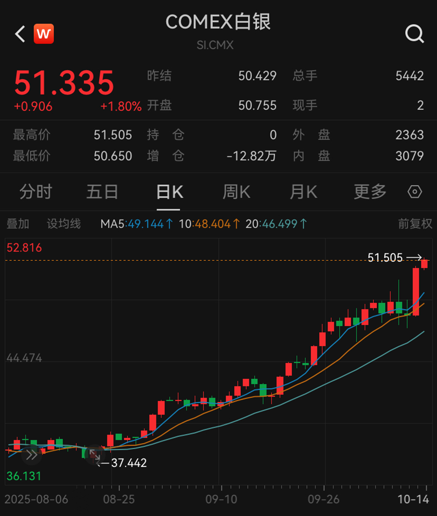 纽约COMEX白银期货主力合约日内暴涨7%,收报50.775美元/盎司。