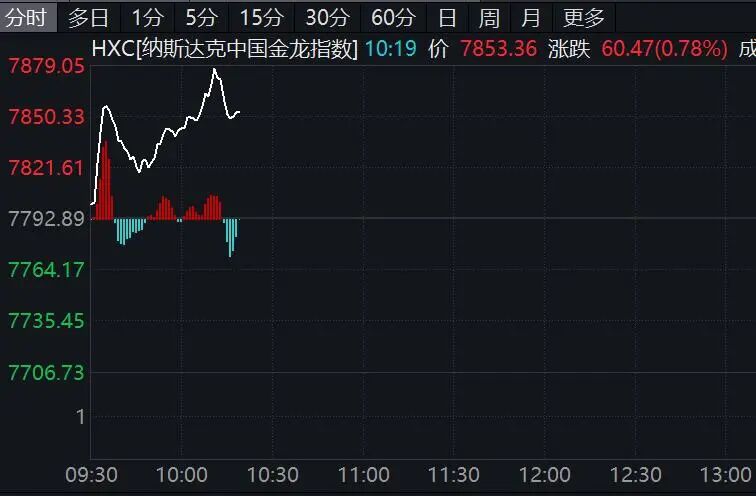 纳斯达克中国金龙指数一度涨超1%,截至发稿,涨超0.7%。正业生物涨逾7%,阿特斯太阳能、新东方、网易等涨近5%。诺亚控股、微博等涨逾3%。