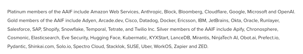 Linux基金会的公告也显示,AAIF的会员单位还有思科、IBM、甲骨文、赛富时、SAP、Shopify、Hugging Face、优步等科技公司和互联网平台企业。