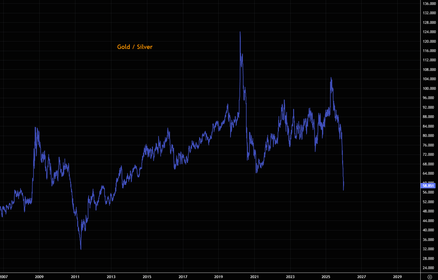 事实上,从技术面、投机仓位、波动率指标、ETF买盘等多个维度来看,目前贵金属的多头氛围依然较为浓厚。当前一个更为有意思的悬念,或许反倒是金银之间的走势对比——那就是在银价愈发极端的飙升下,金银比究竟还会跌到多低?