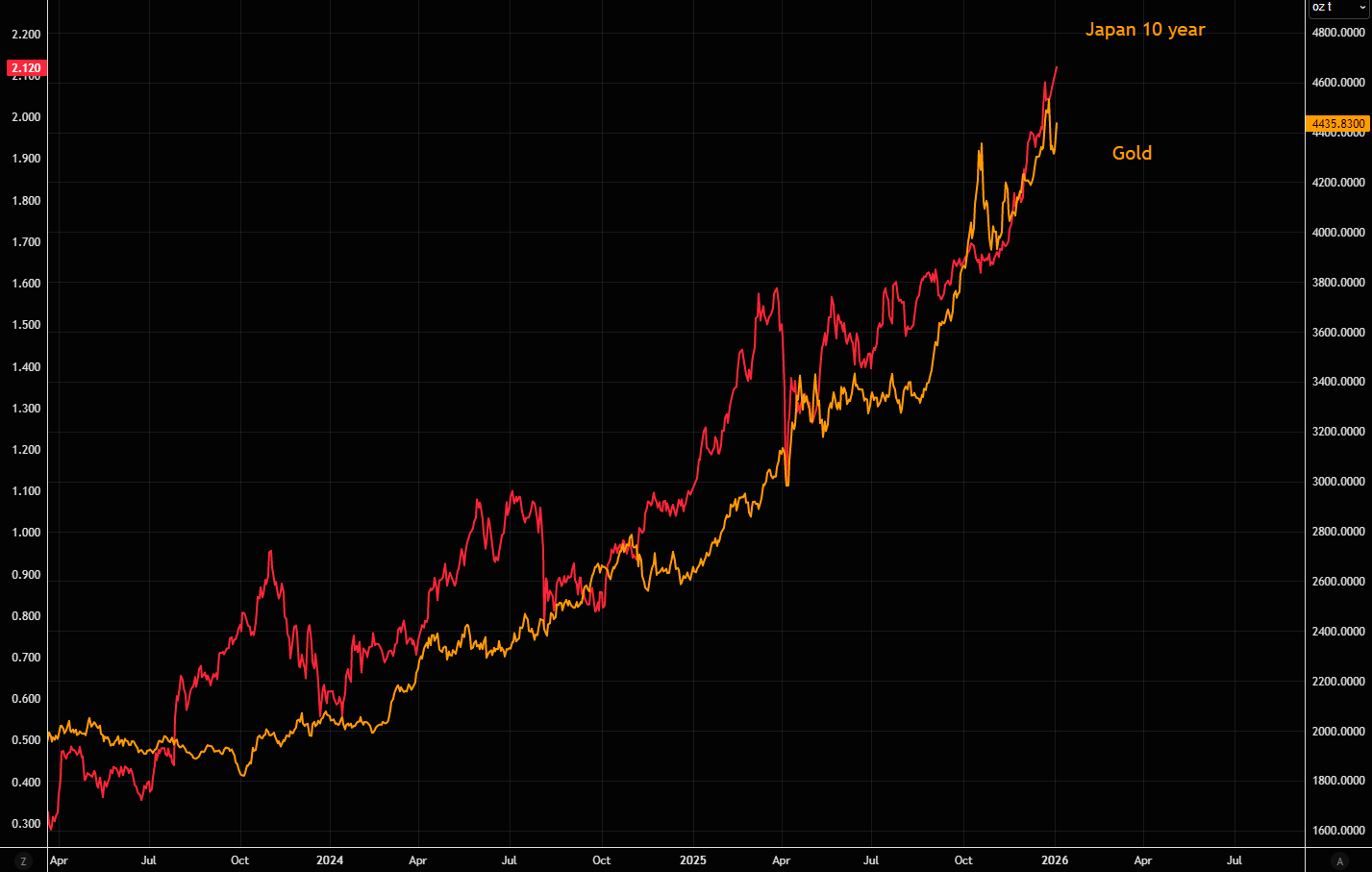 周末委内瑞拉的突发事件确实引发了“全球秩序”的新迷雾,提振了金价。但需要注意的是,此轮上涨不仅源于地缘政治因素。传统驱动因素也正在重现——尤以日本长期收益率再度上行为首。可以看到,过去两年金价与其几乎同步走高。