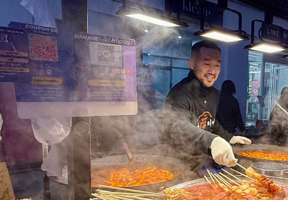 明洞夜市是海外游客必到的首尔烟火气打卡地,众多摊主都挂出支付宝和Alipay+标识。1–11月,海外游客通过Alipay+支持的电子钱包,在此产生的消费额同比暴涨近626%。