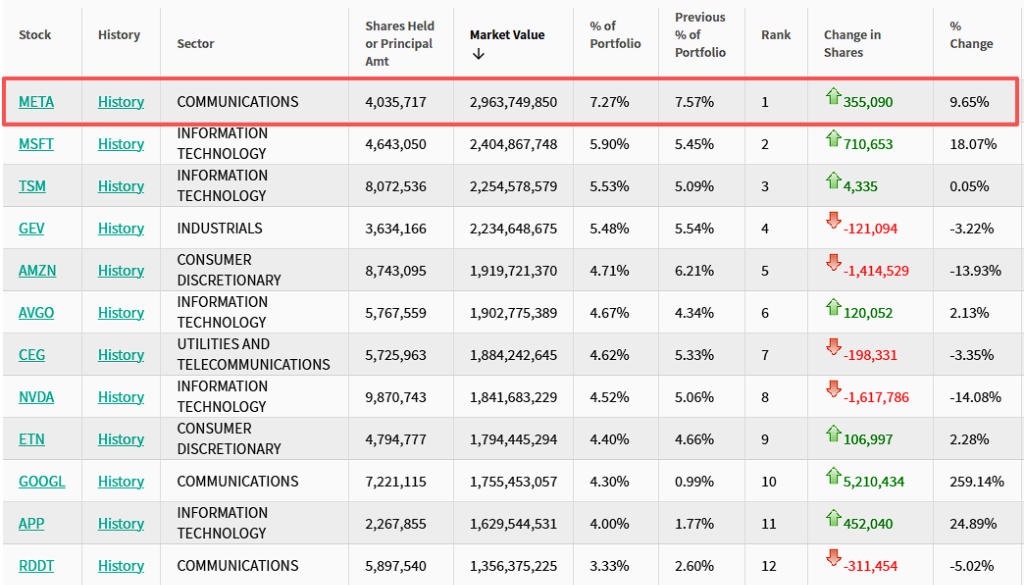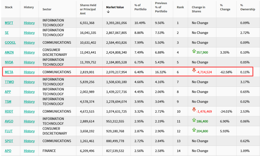 不过,并非所有机构都在撤退。Coatue Management逆势增持约35.5万股Meta股票,将其从第二大重仓股提升为第一大持仓。