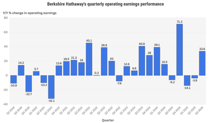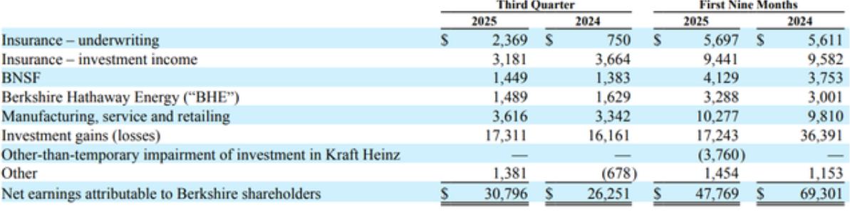 具体的财报数据显示,伯克希尔第三季度的营业利润同比大幅跃升33.6%至134.9亿美元。此前该商业帝国在第二季度与第一季度连续出现同比显著下降后,终于在第三季度重回营业利润增长轨道。这一核心业绩指标的强劲增长表现,标志着该公司全资业务板块的显著复苏,涵盖保险和铁路等核心业务。