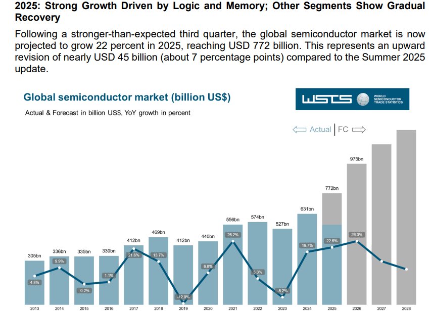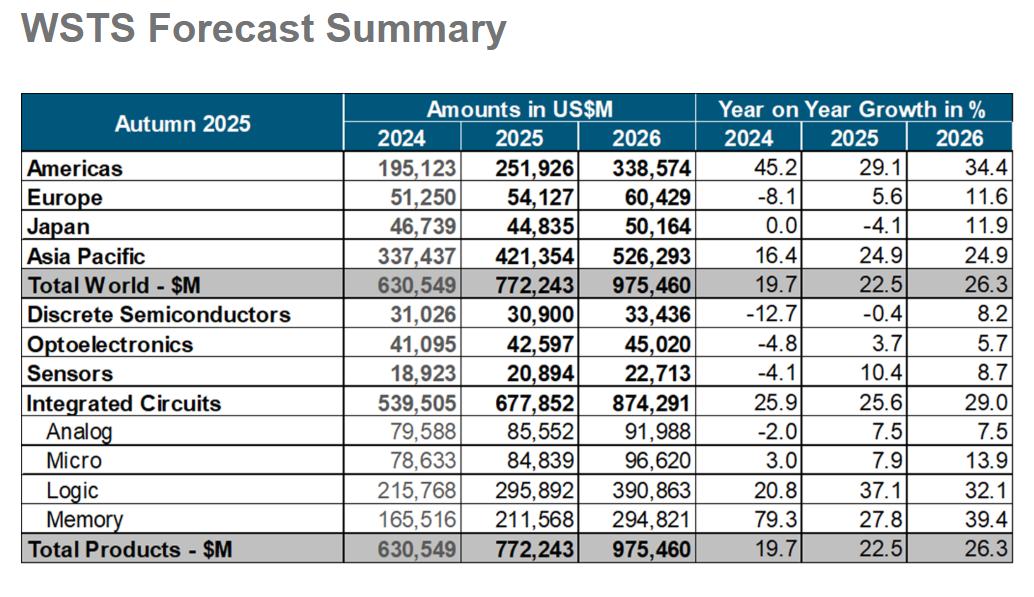 WSTS预计继2024年强劲反弹之后,2025年全球半导体市场将大幅增长22.5%,总价值将达到7722亿美元,高于WSTS春季给出的展望;2026年半导体市场总价值则有望在2025年的强劲增长基础之上大举扩张至9755亿美元,接近SEMI预测的2030年1万亿美金的市场规模目标,意味着有望同比大增26%。