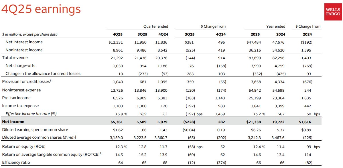 智通财经APP获悉,富国银行(WFC.US)公布了第四季度财务业绩。数据显示,Q4营收为212.9亿美元,同比增长4%,略低于华尔街预期的216亿美元。Q4非GAAP每股收益为1.76美元,高于市场预期的1.69美元。富国银行2025年净利润达到213亿美元,而分析师此前预计为 216 亿美元。