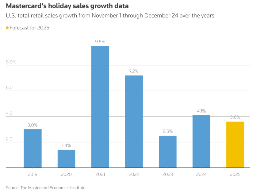 万事达卡经济研究所的报告预测,今年美国假日季(11月1日至12月24日)期间,美国的零售销售额将仅增长3.6%,而去年同期的增长率为4.1%。