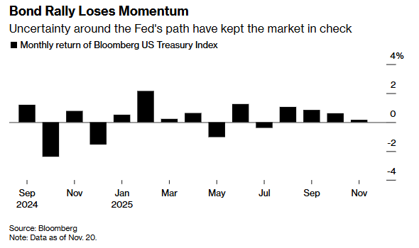 分析人士指出,近期规模达30万亿美元的美国债券市场交易区间愈发收窄,因就业与通胀数据缺乏明确信号——部分受政府停摆造成的数据扭曲影响——这也正导致美联储决策者意见分歧,年底能否实现今年第三次降息变得愈发充满不确定性。