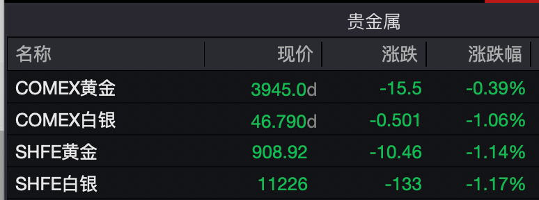 黄金、白银大跌。国内昨夜黄金期货主力合约收盘报908.92元/克。11月5日早盘,国际黄金、白银延续跌势,COMEX黄金最新报3945美元/盎司,COMEX白银报46.790美元/盎司。