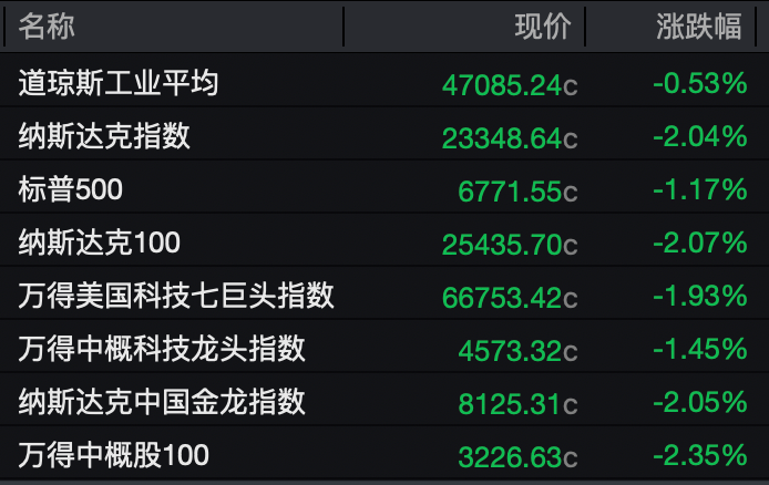 昨夜,美股三大指数集体收跌。纳指跌2.04%,标普500指数跌1.17%,道指跌0.53%。大型科技股普跌,英特尔跌超6%,特斯拉跌超5%,英伟达跌超3%,谷歌跌逾2%,亚马逊、Meta跌超1%,奈飞小幅下跌。