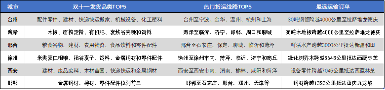 根据运满满城市数观,双十一期间(10月20日至11月2日),邢台、徐州、西安、邯郸的发货总量分别环比增长5.11%、3.03%、44.56%和29%。区域特色产业亦展现出强劲动能:台州鲜活水产与橘柑柚类合计发运近2万吨;菏泽曹县宠物粮出货1271吨,居全国区县第五,牡丹苗发运2791吨,位列全国第二。