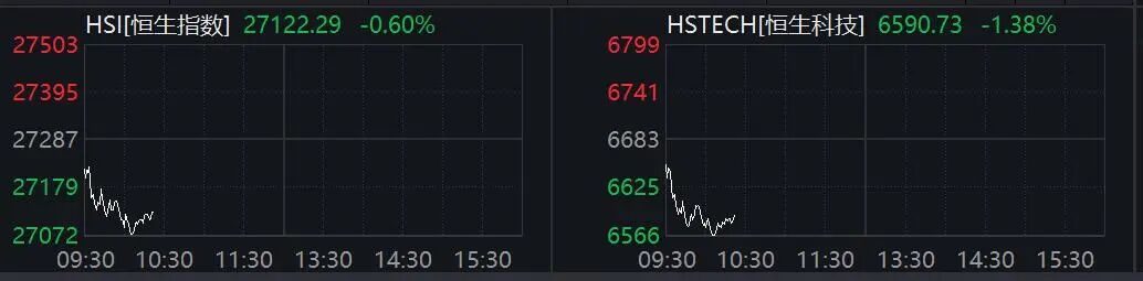 港股方面,恒生指数开盘下跌,恒生指数开盘报27221.46点,跌幅0.24%;恒生科技指数开盘报6653.26点,跌幅0.44%。开盘后恒生科技指数回落跌逾1%。