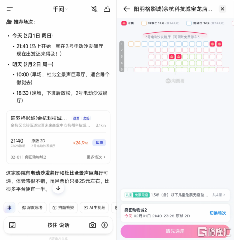 有网友注意到,查询电影票时,已能在千问APP主对话页面购买电影票。记者从千问APP内部人士获悉,AI买电影票功能正在灰测,即将全面上线。