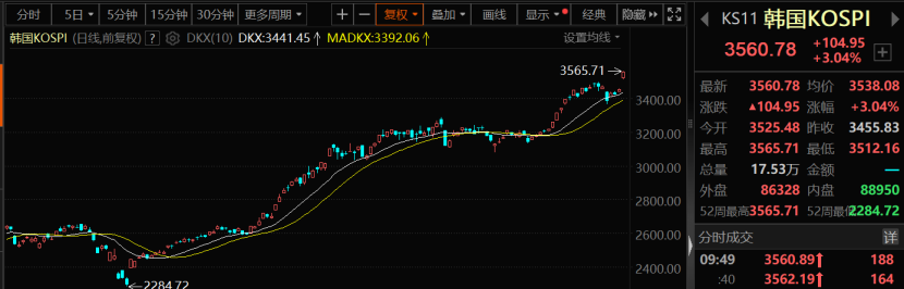 10月2日早盘,韩国综合指数涨超3%,续刷历史新高。芯片股大涨,SK海力士涨超11%,刷新历史新高,三星电子涨超4%。