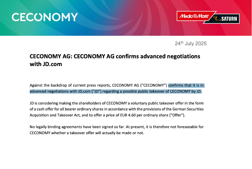 当地时间7月24日,德国消费电子零售商Ceconomy公告确认,正在与京东深入洽谈潜在收购事宜。公告称,京东正考虑发出公开收购要约,对每股Ceconomy股份出价4.60欧元现金。Ceconomy表示,截至目前,双方尚未签署具有法律约束力的协议,因此不确定京东是否会提出正式收购要约。据媒体报道,本次潜在交易对