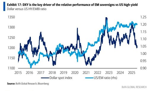 美银还表示,美元走势是影响新兴市场资产表现的关键因素,而目前正从长期阻力转为潜在助力。过去十年,美元走强是新兴市场表现不佳的重要原因,但当前美元已显现结构性走弱迹象。调查显示,亚洲和欧洲等储蓄盈余地区正寻求多元化投资,减少对美元资产的依赖,这将直接推动资金流入新兴市场,并从结构上削弱美元。