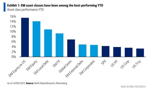 尽管全球经济增长放缓,新兴市场(EM)资产却在2025年上半年交出亮眼成绩单。美国银行对此在一份标题为《新兴市场信念:旧时代已逝,新时代万岁》的研报中表示,新兴市场本地货币资产年内回报率超10%,硬通货债务表现也跑赢美国国债。然而,传统基金流向数据却未能反映这一趋势,凸显市场认知与实际表现的“断层”。总的来说,美银继续维持自总统就职日(1月21日)以来对新兴市场的结构性看多观点。